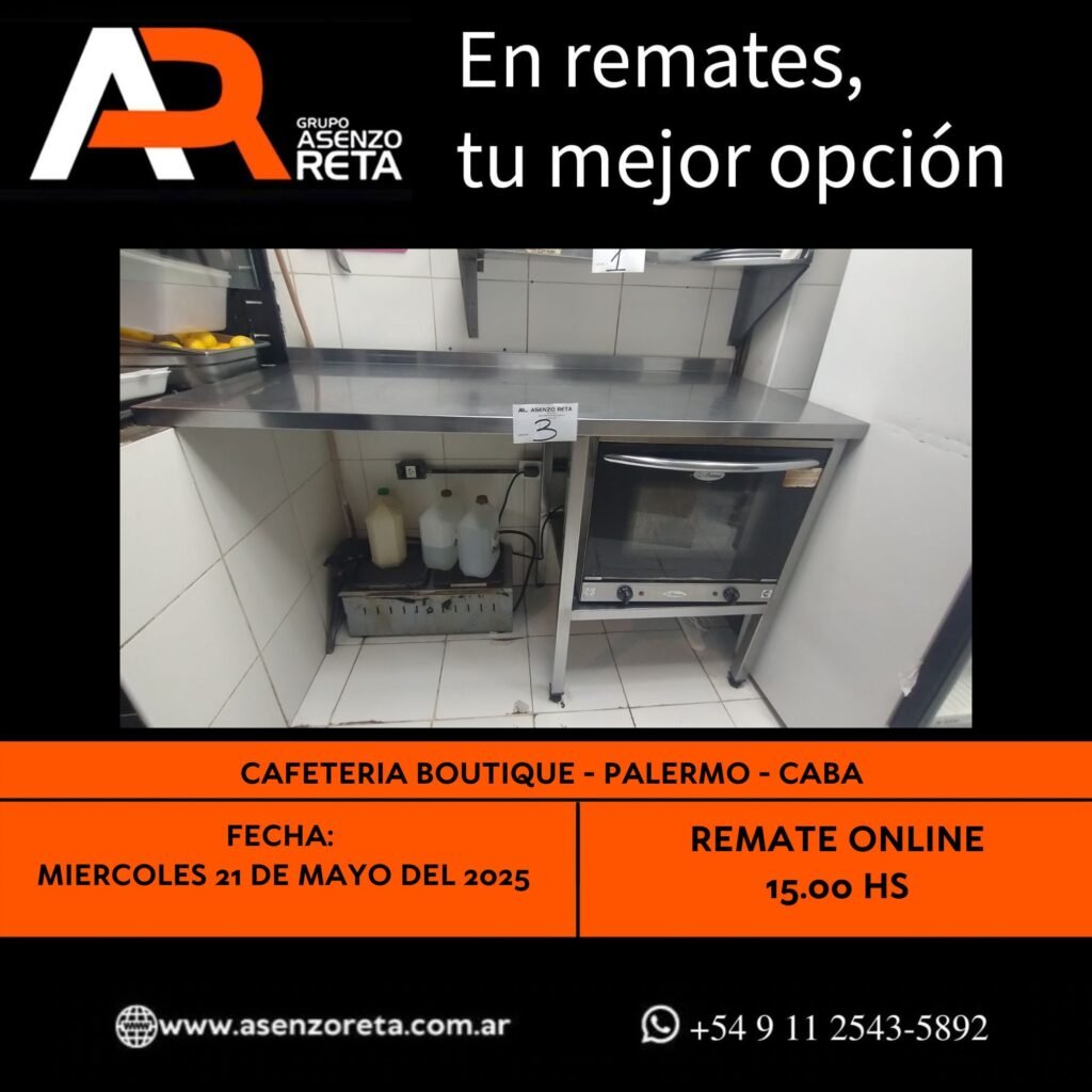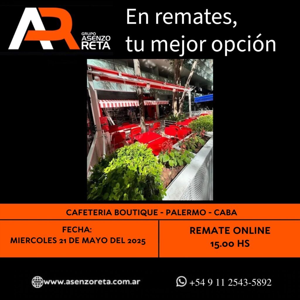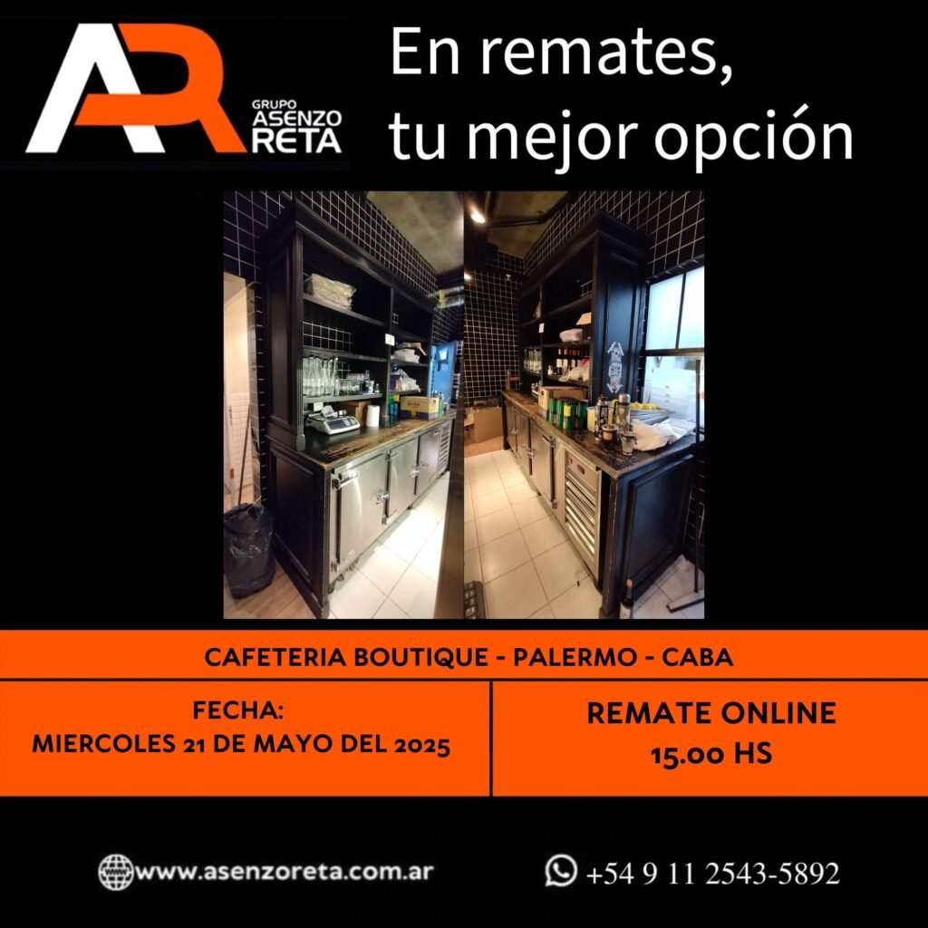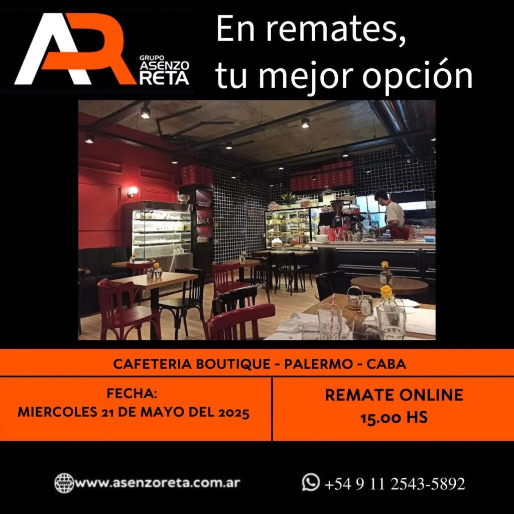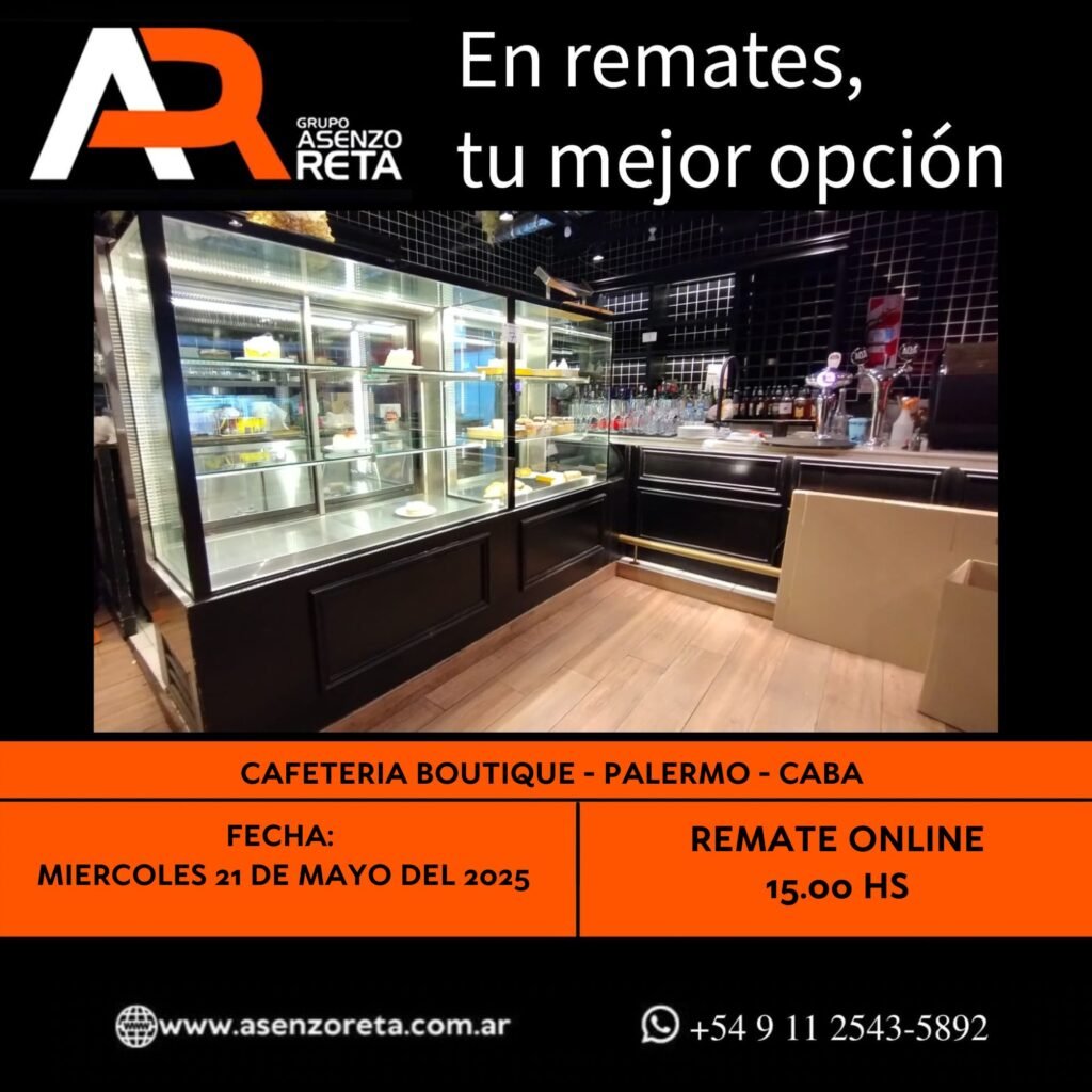 575° CAFETERIA BOUTIQUE – PALERMO- CABA – MIERCOLES 21 DE MAYO DEL 2025. INICIO DEL REMATE 15.00 HS PODES DESCARGARTE LOS PDF O CONSULTARNOS POR WHATSAPP PARA MAS INFORMACION! RECUERDE SOLICITAR SU LINEA DE CREDITO PARA PARTICIPAR DEL REMATE