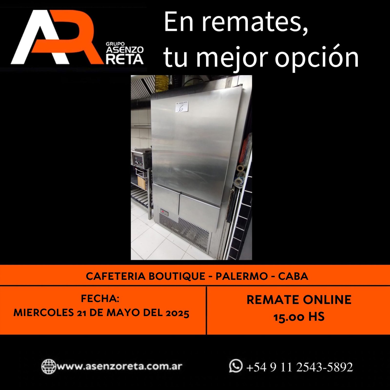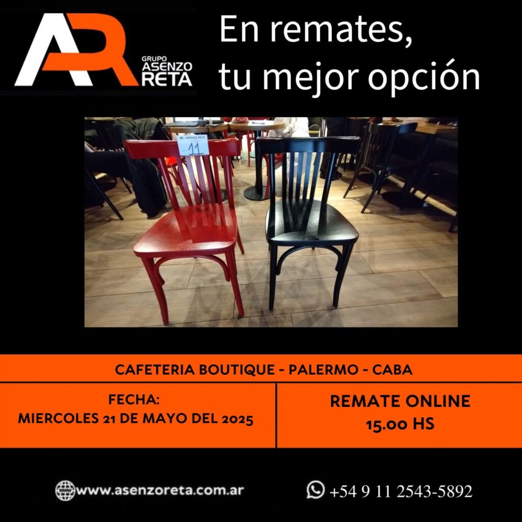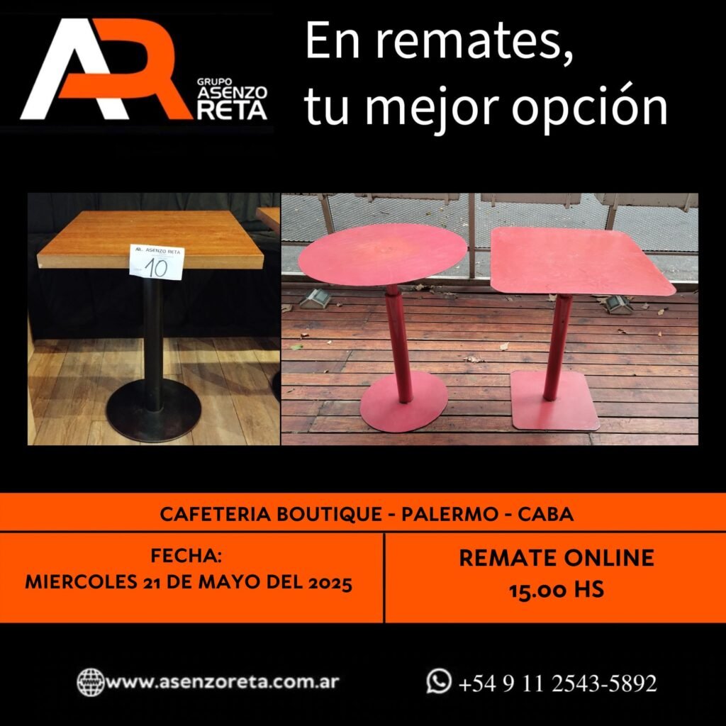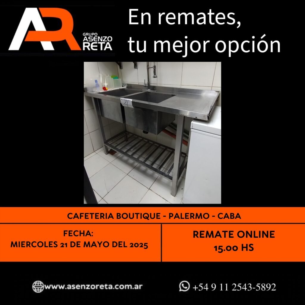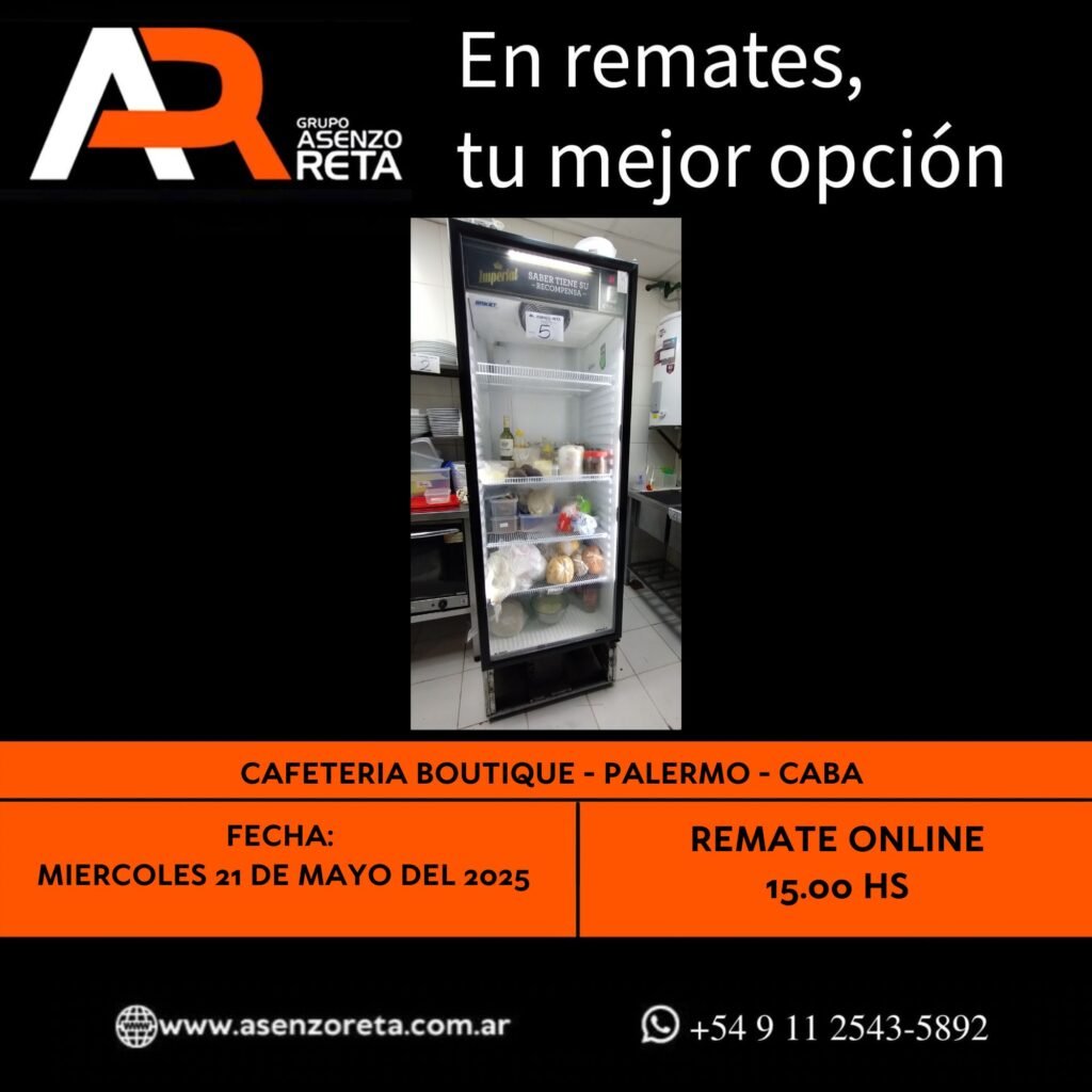 575° CAFETERIA BOUTIQUE – PALERMO- CABA – MIERCOLES 21 DE MAYO DEL 2025. INICIO DEL REMATE 15.00 HS PODES DESCARGARTE LOS PDF O CONSULTARNOS POR WHATSAPP PARA MAS INFORMACION! RECUERDE SOLICITAR SU LINEA DE CREDITO PARA PARTICIPAR DEL REMATE