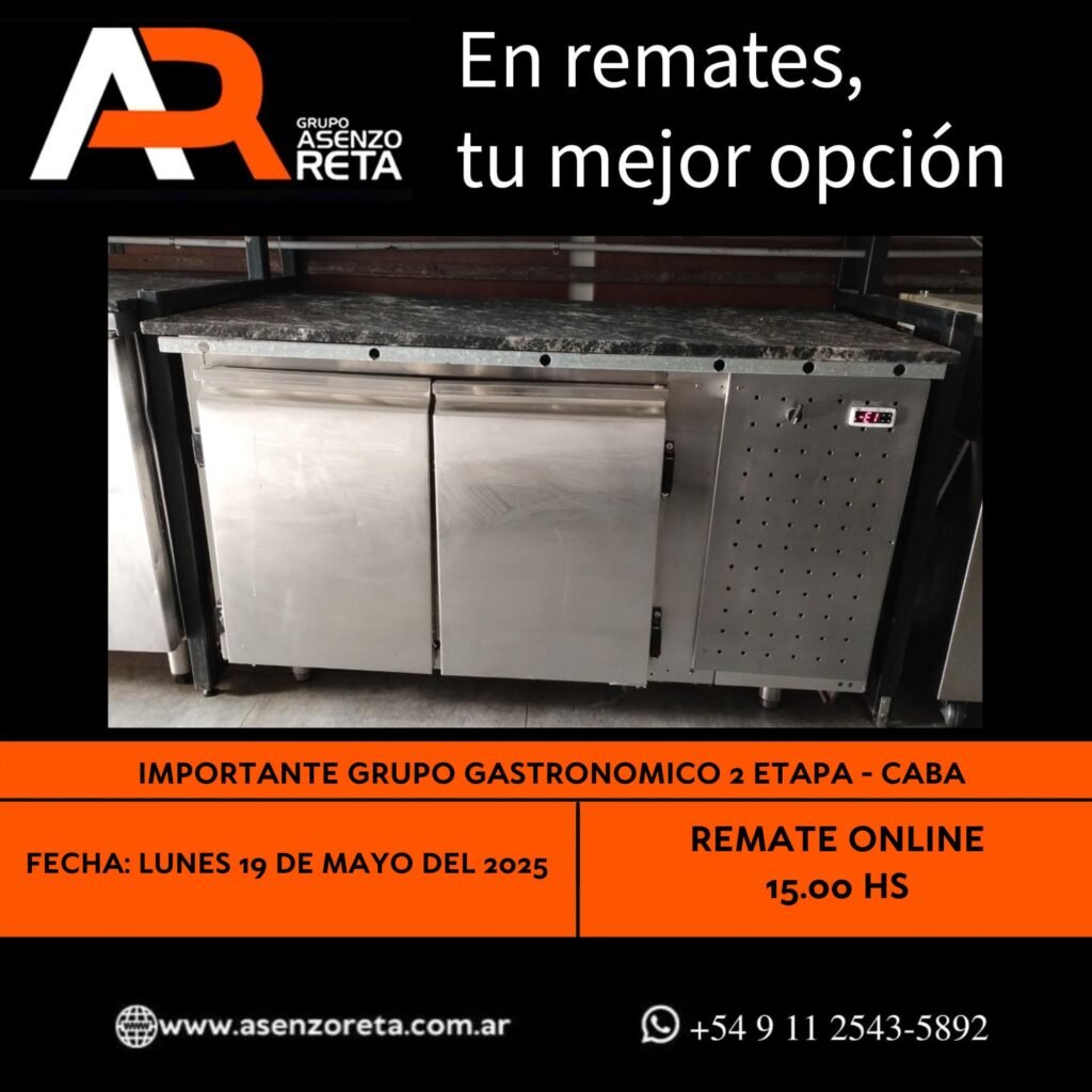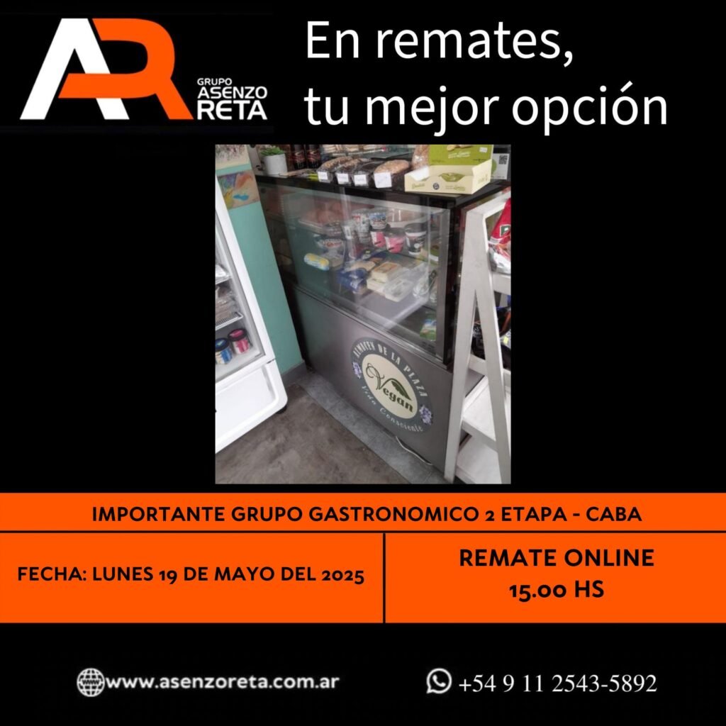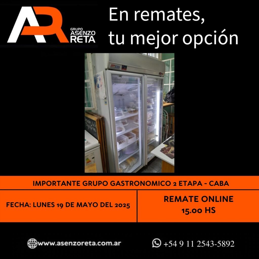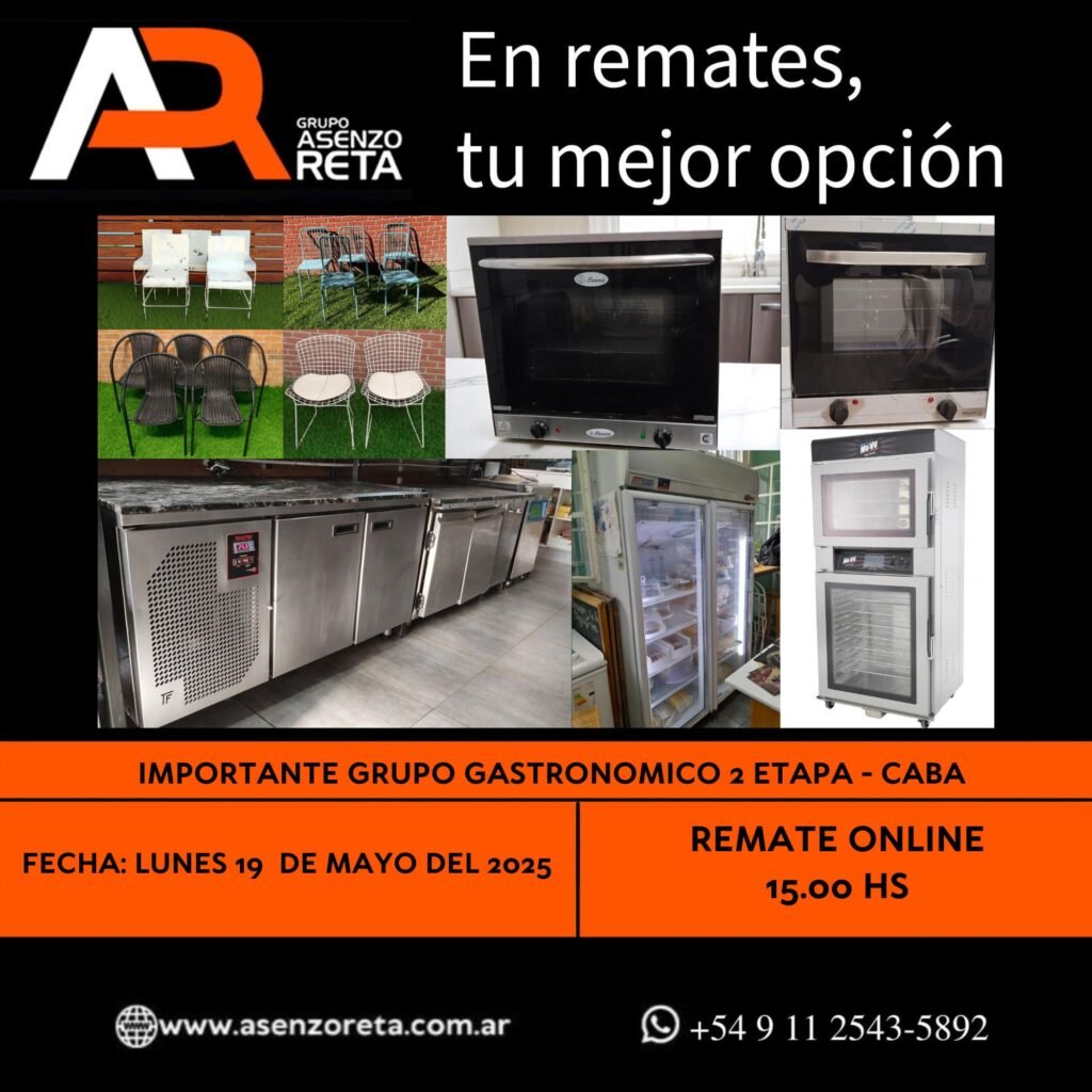 573° IMPORTANTE GRUPO GASTRONOMICO 2DA ETAPA – CABA – LUNES 19 DE MAYO DEL 2025. INICIO DEL REMATE 15.00 HS PODES DESCARGARTE LOS PDF O CONSULTARNOS POR WHATSAPP PARA MAS INFORMACION! RECUERDE SOLICITAR SU LINEA DE CREDITO PARA PARTICIPAR DEL REMATE
