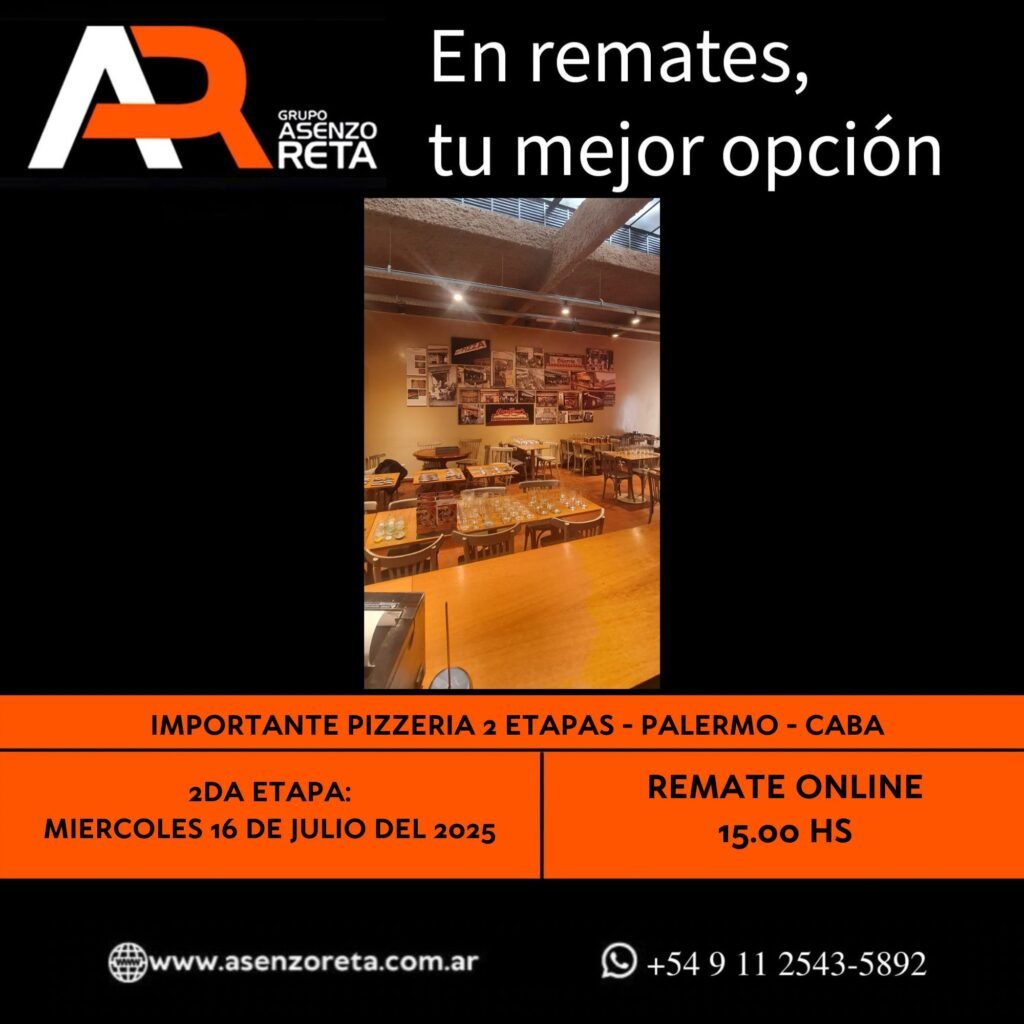 591° IMPORTANTE PIZZERIA 2DA ETAPA – PALERMO – CABA – MIERCOLES 16 DE JULIO DEL 2025. INICIO DEL REMATE 15.00 HS PODES DESCARGARTE LOS PDF O CONSULTARNOS POR WHATSAPP PARA MAS INFORMACION! RECUERDE SOLICITAR SU LINEA DE CREDITO PARA PARTICIPAR DEL REMATE