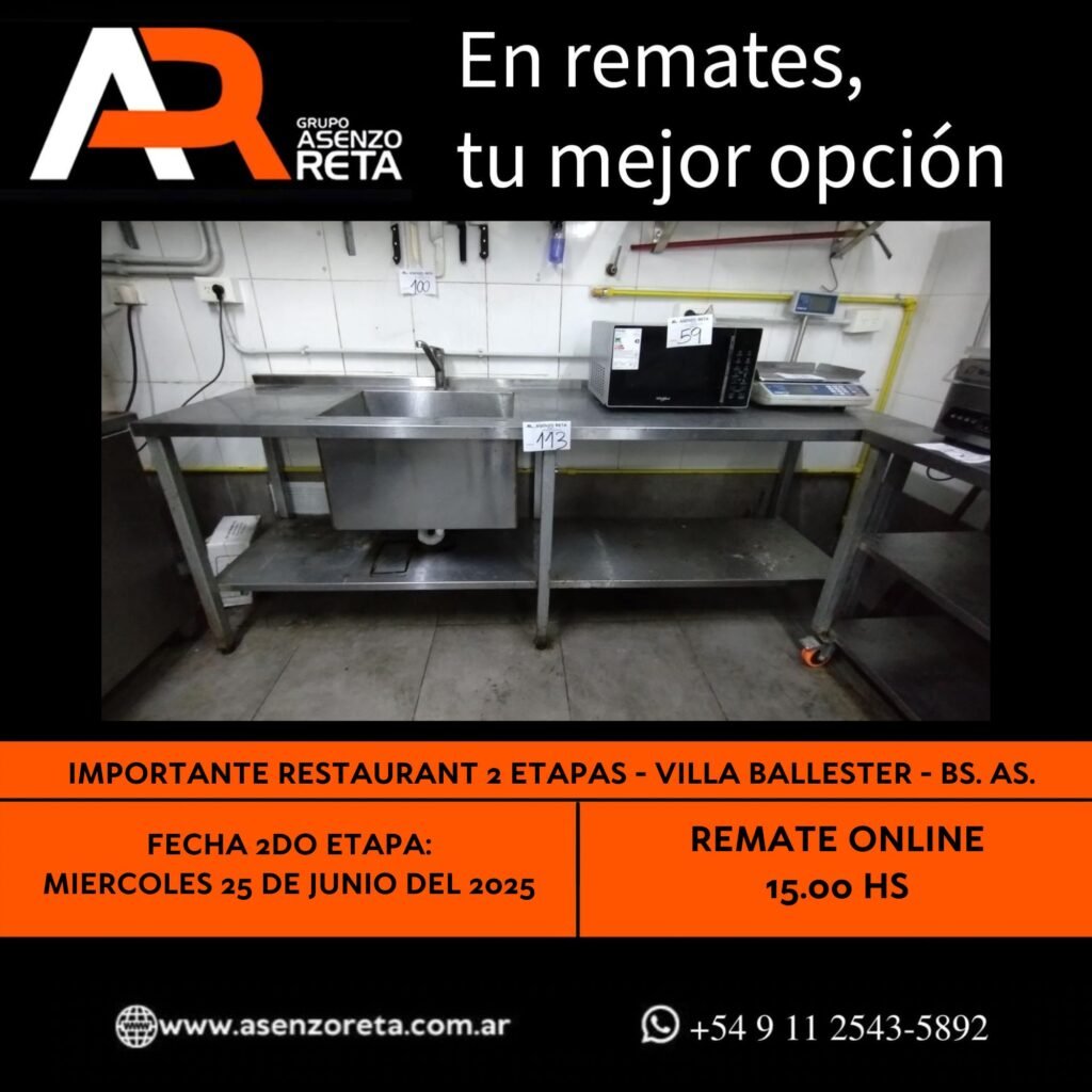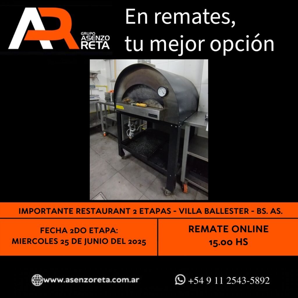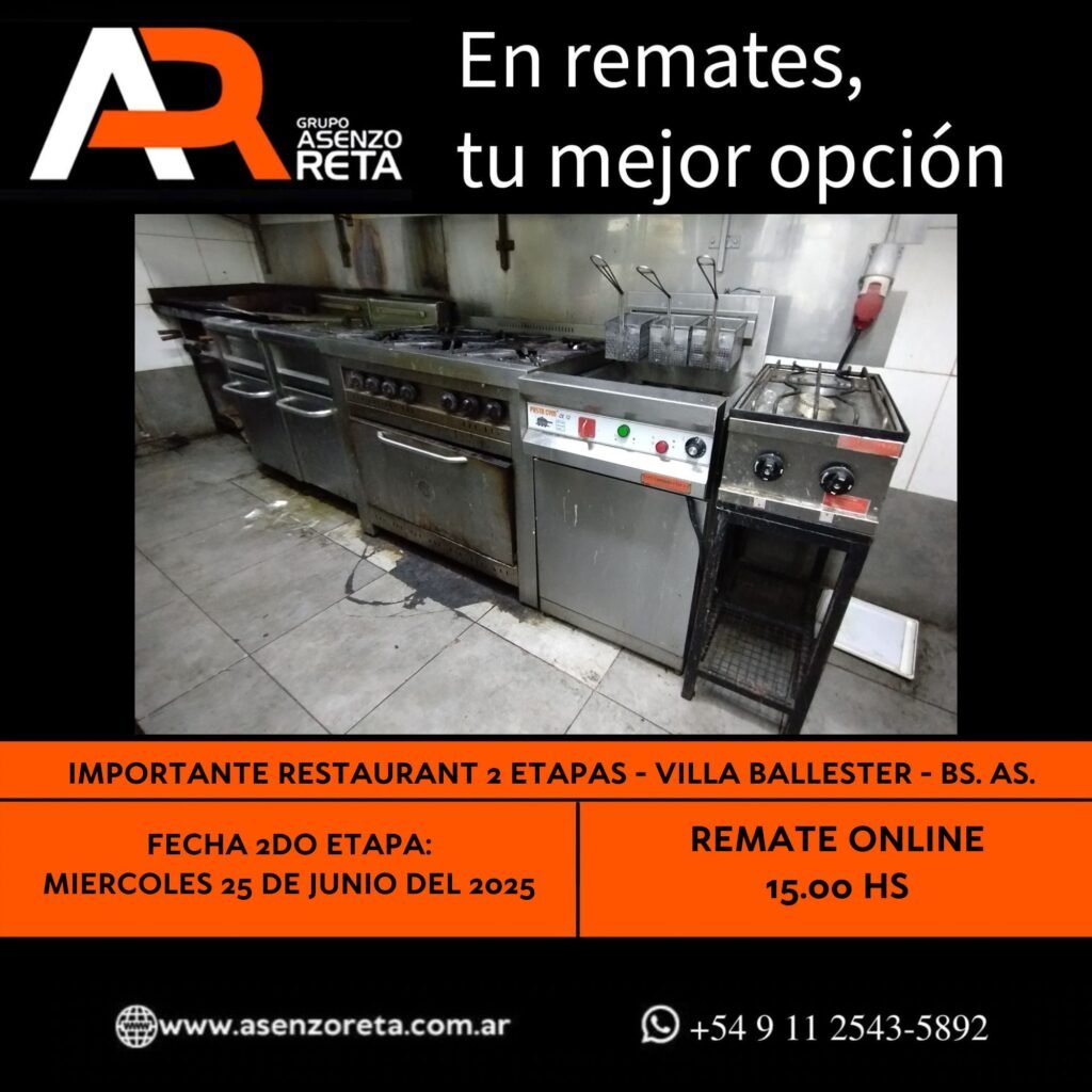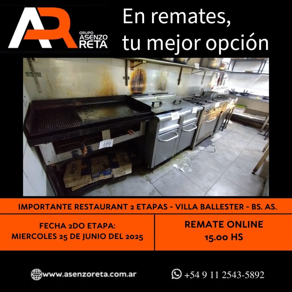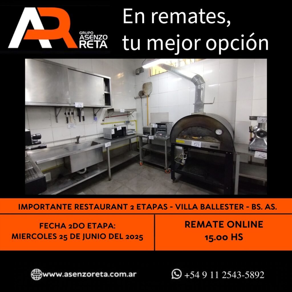 585° IMPORTANTE RESTAURANT 2DA ETAPA – VILLA BALLESTER – BS. AS. – MIERCOLES 25 DE JUNIO DEL 2025. INICIO DEL REMATE 15.00 HS PODES DESCARGARTE LOS PDF O CONSULTARNOS POR WHATSAPP PARA MAS INFORMACION! RECUERDE SOLICITAR SU LINEA DE CREDITO PARA PARTICIPAR DEL REMATE