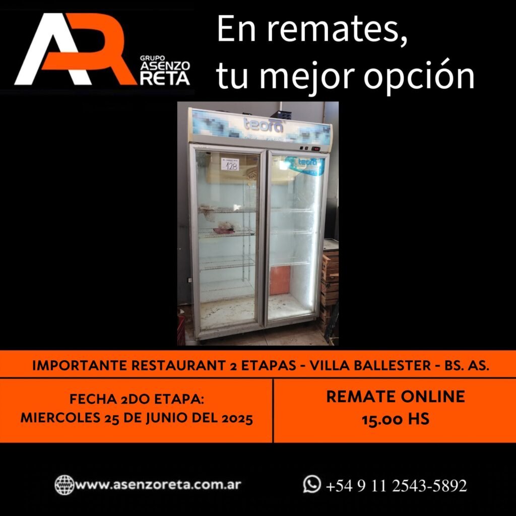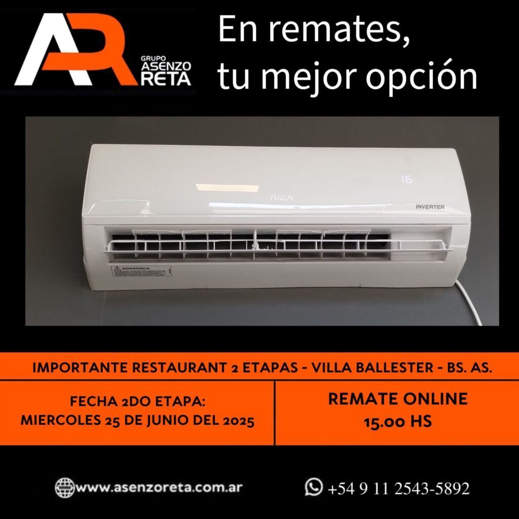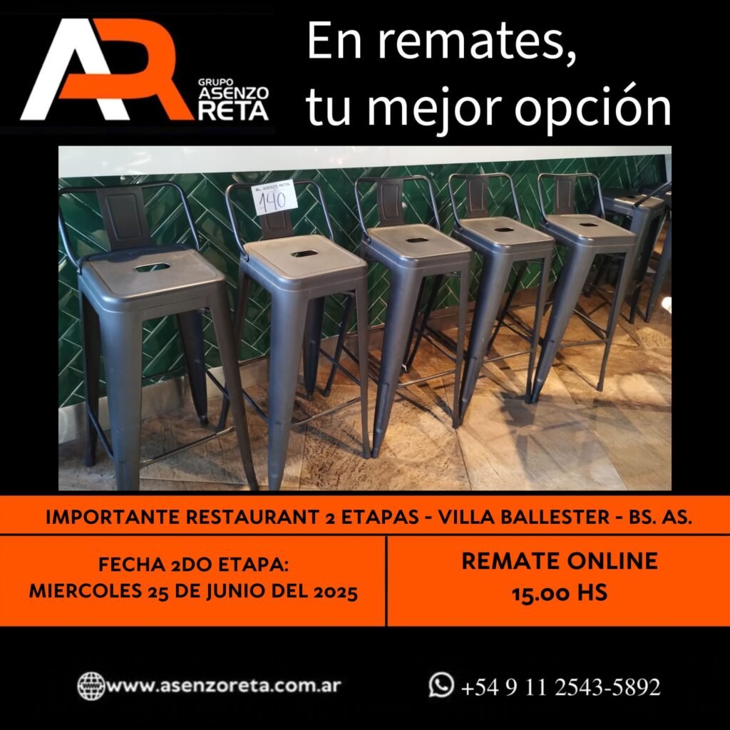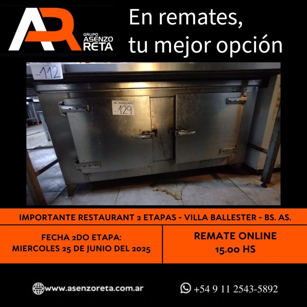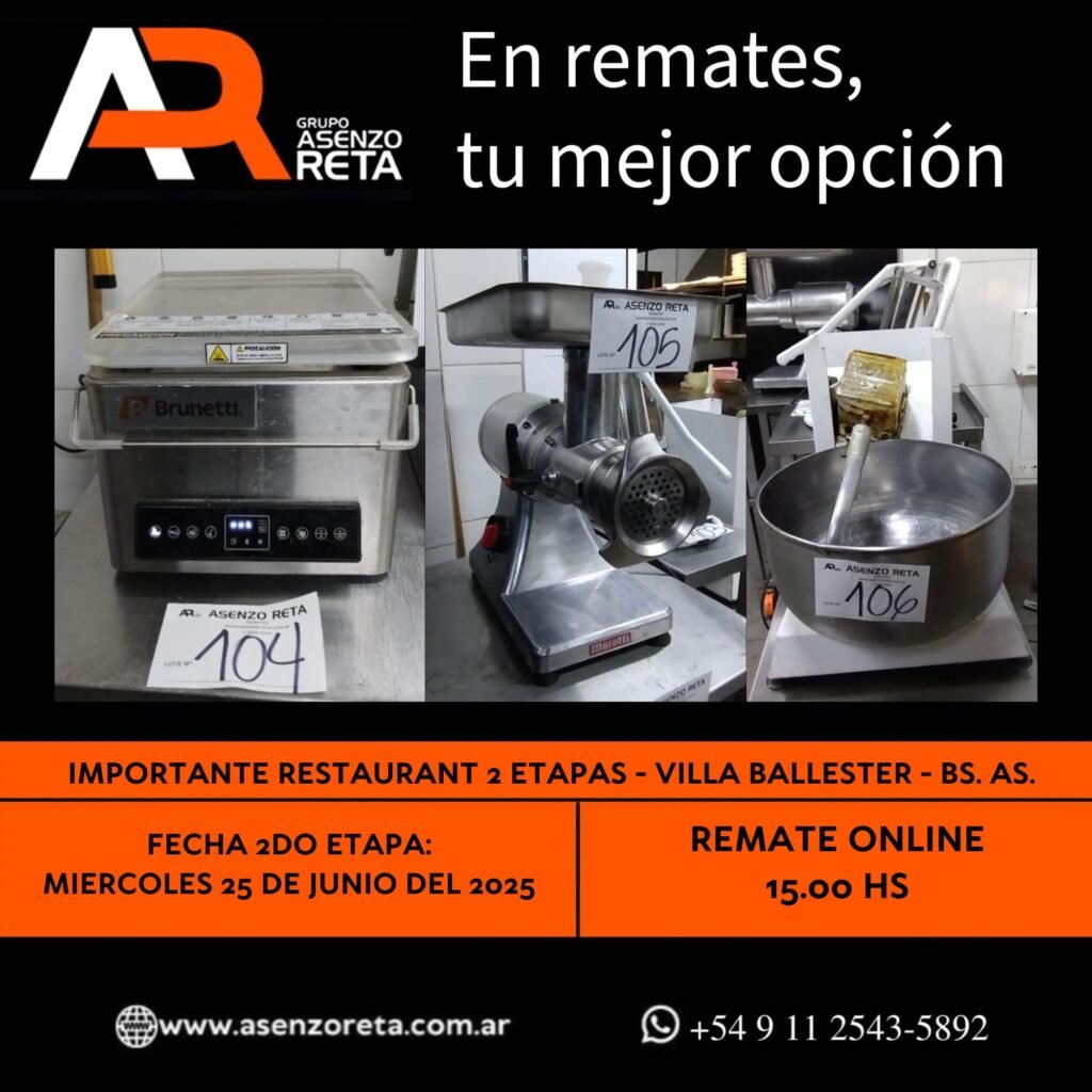 585° IMPORTANTE RESTAURANT 2DA ETAPA – VILLA BALLESTER – BS. AS. – MIERCOLES 25 DE JUNIO DEL 2025. INICIO DEL REMATE 15.00 HS PODES DESCARGARTE LOS PDF O CONSULTARNOS POR WHATSAPP PARA MAS INFORMACION! RECUERDE SOLICITAR SU LINEA DE CREDITO PARA PARTICIPAR DEL REMATE